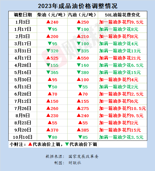 财联社10月10日电,国家发改委发布通知,今天(10月10日)24时起,汽油下调85元/吨,柴油下调80元/吨。按一般家用汽车油箱50L容量估测,加满一箱92号汽油,将少花3.5元。据国家发改委价格监测中心监测,本轮成品油调价周期内(9月20日—10月9日)国际油价大幅震荡。平均来看,伦敦布伦特、纽约WTI油价比上轮调价周期略降0.72%。
