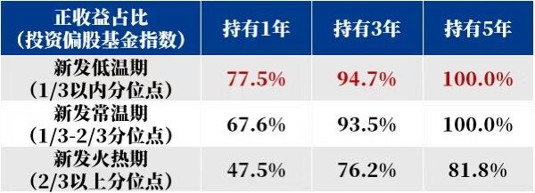 风险提示:WIND,取样区间2013.1.1-2023.6.30。权益类基金指股票型基金和混合型基金,发行份额以月度计算。新发低温、正常、火热期分别对应权益类基金发行份额历史分位点1/3以内,1/3-2/3之间,2/3以上进行统计,计算方式:假设2013年1月起每月末投资偏股基金指数(930950)分别持有1、3、5年,不同持有期正收益占比=对应区间内正收益样本数/对应区间内总样本数。模拟测算投资于偏股基金指数,不能代表单只成分基金的表现。模拟测算仅供参考,不代表真实收益,不预示未来收益。我国证券市场发展时间较短,不能反映市场发展的所有阶段,历史不代表未来,投资须谨慎。