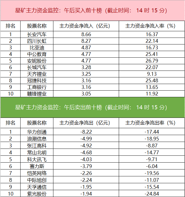 财联社10月12日电,财联社星矿数据显示,今日主力资金净流入交运设备、有色金属、电新行业等板块,净流出计算机、电子、文化传媒等板块,其中计算机板块净流出35.37亿元。个股方面,长安汽车大涨,主力资金净买入8.66亿元,四川长虹、比亚迪、中公教育获主力资金净流入居前;华力创通遭净卖出超8亿元,浪潮信息、张江高科、常山北明等主力资金净流出额居前。