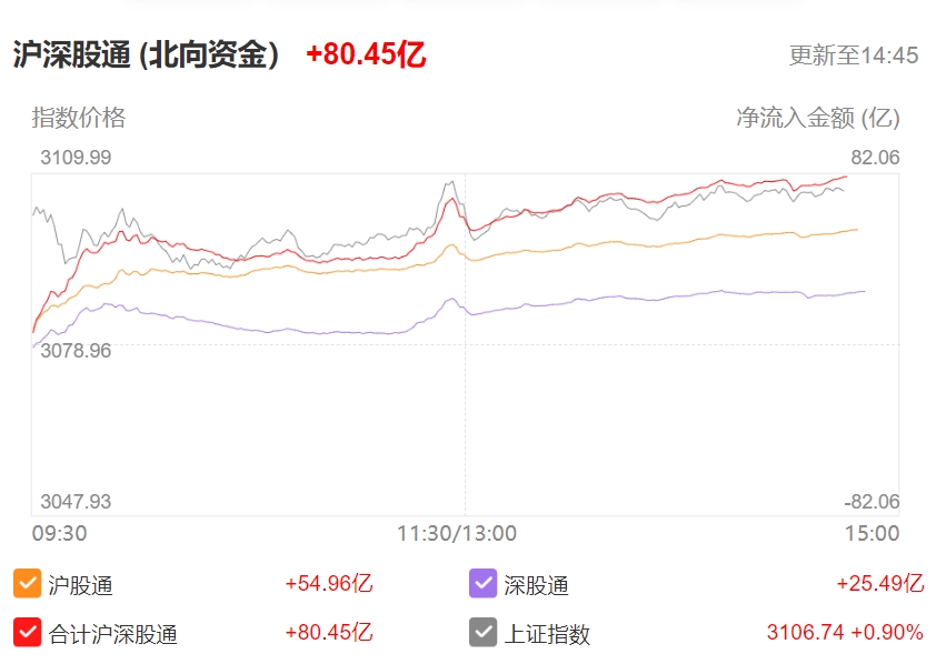 财联社10月12日电,北向资金午后延续早盘做多势头,截至目前,北向资金净流入超80亿元,其中沪股通净流入超54亿元,深股通净流入超25亿元。