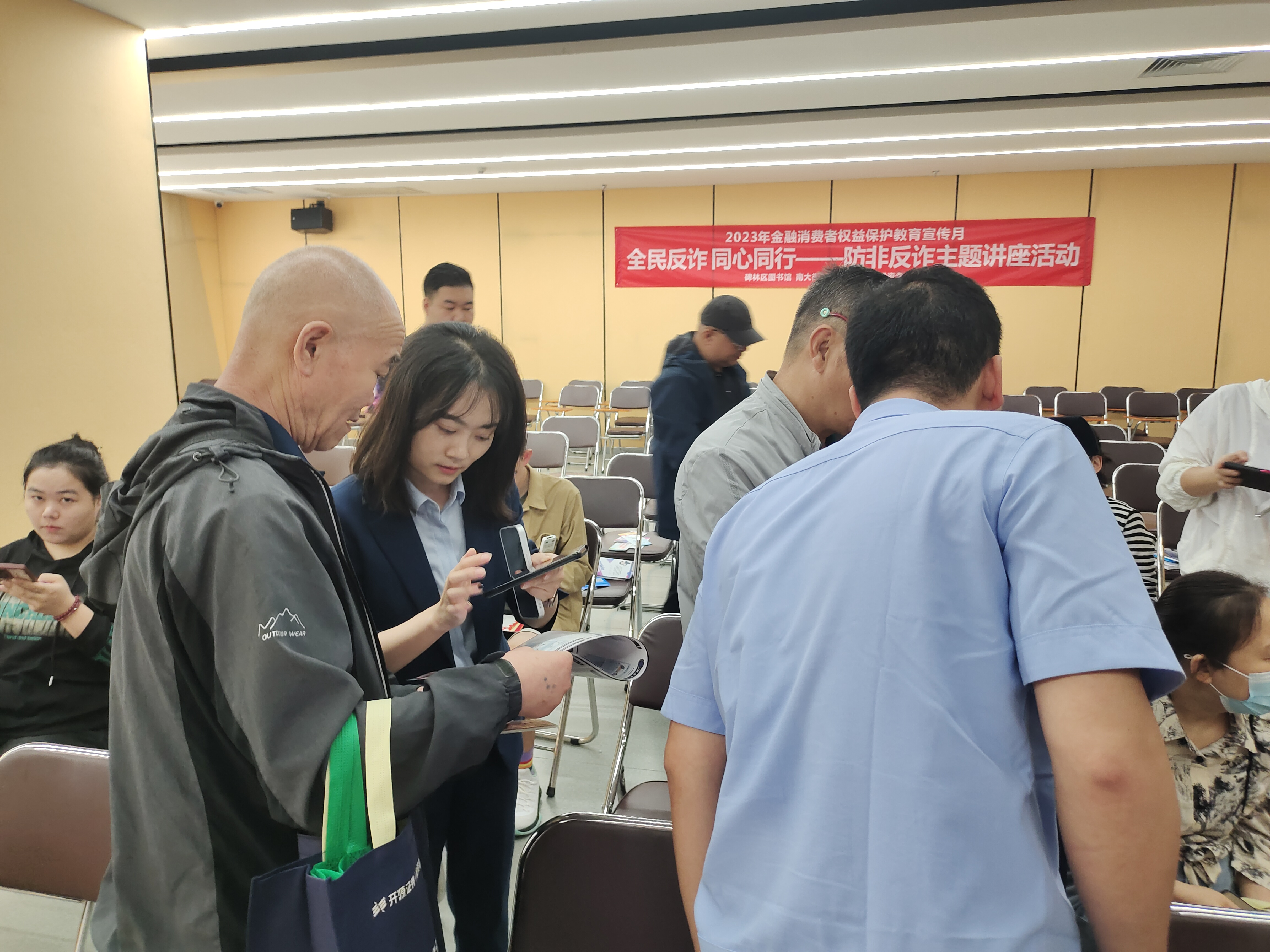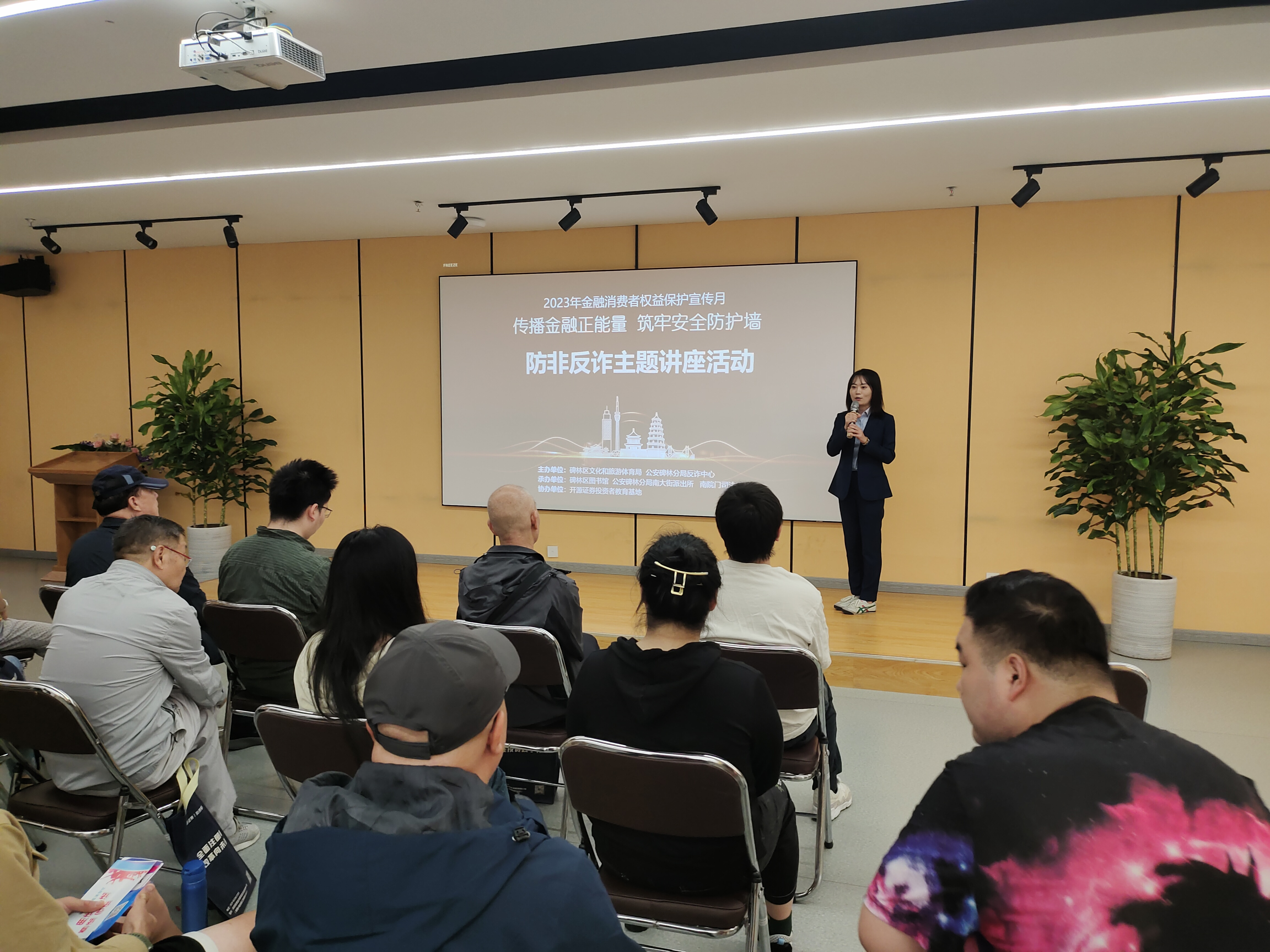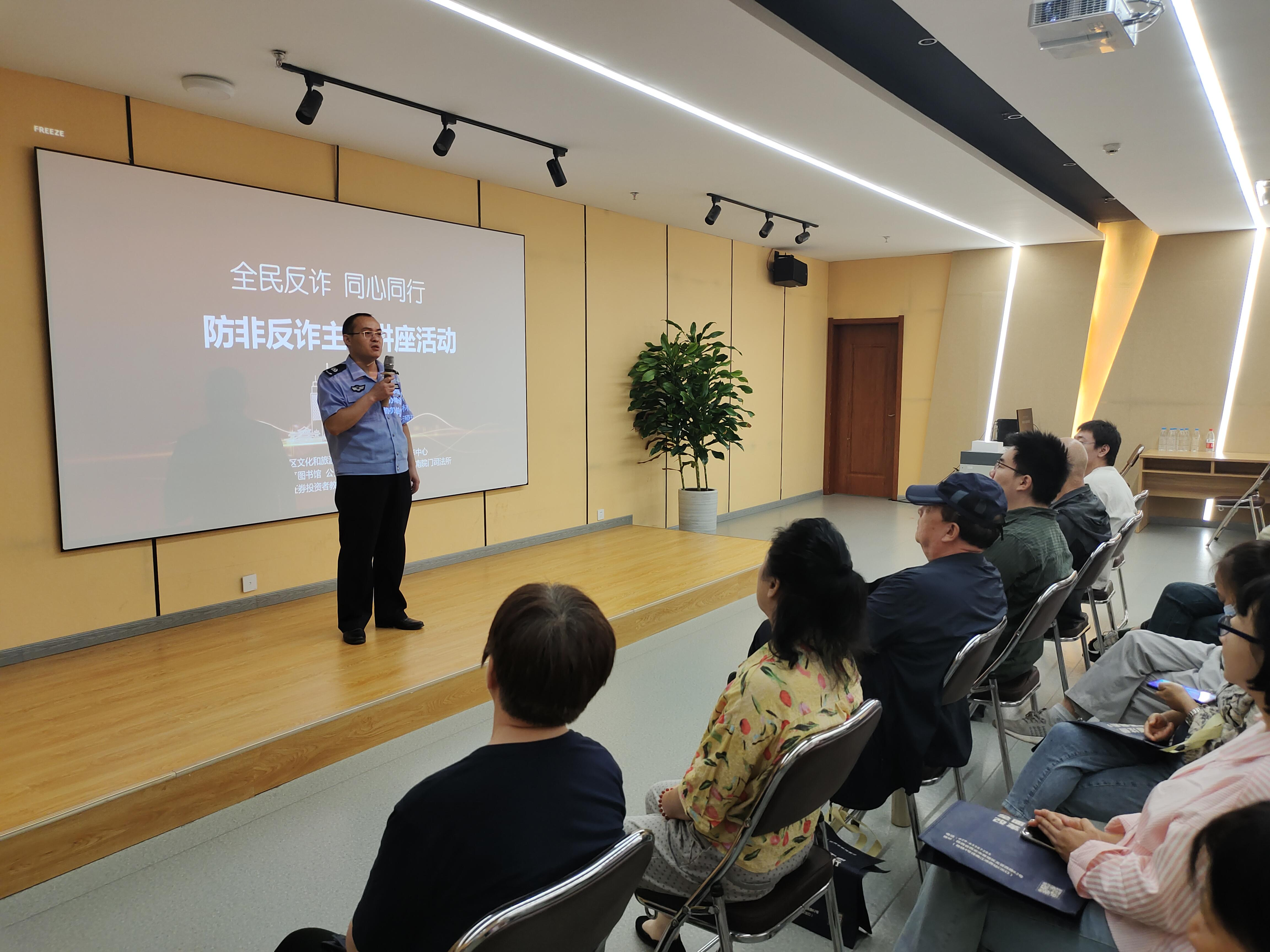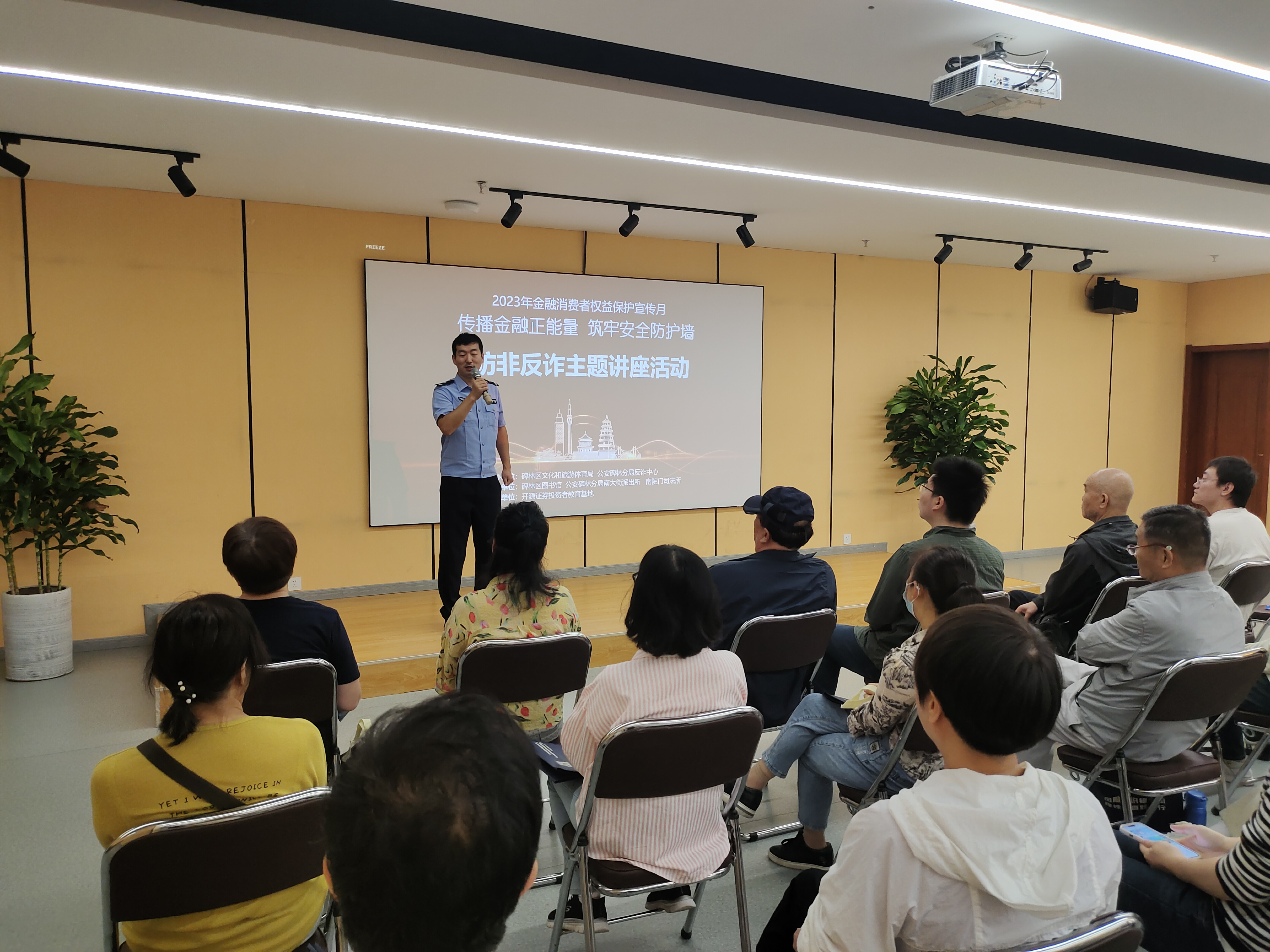 传播金融正力量,筑牢安全防护墙。为持续营造全民防非反诈社会氛围,提升人民群众金融素养,在2023年金融消费者权益保护宣传月期间,9月22日,开源证券投资者教育基地联合公安碑林分局南大街派出所、南院门司法所共同举办的“防非反诈主题讲座”活动。