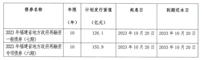 财联社10月12日电,福建省财政厅公告,经福建省人民政府同意,决定公开发行2023年福建省地方政府再融资一般债券(七期)、再融资专项债券(六期),计划发行面值分别为126.1亿元、155.9亿元。招标时间为:2023年10月19日9:30-10:10。再融资债券募集资金投向:发行地方政府再融资债券偿还存量债务。