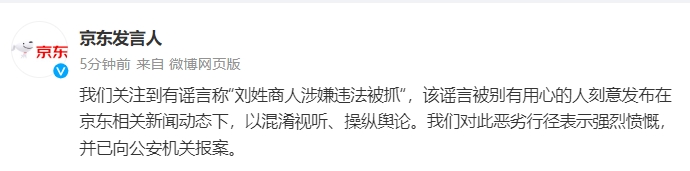 京东:关注到有谣言称“刘姓商人涉嫌违法被抓”已报案