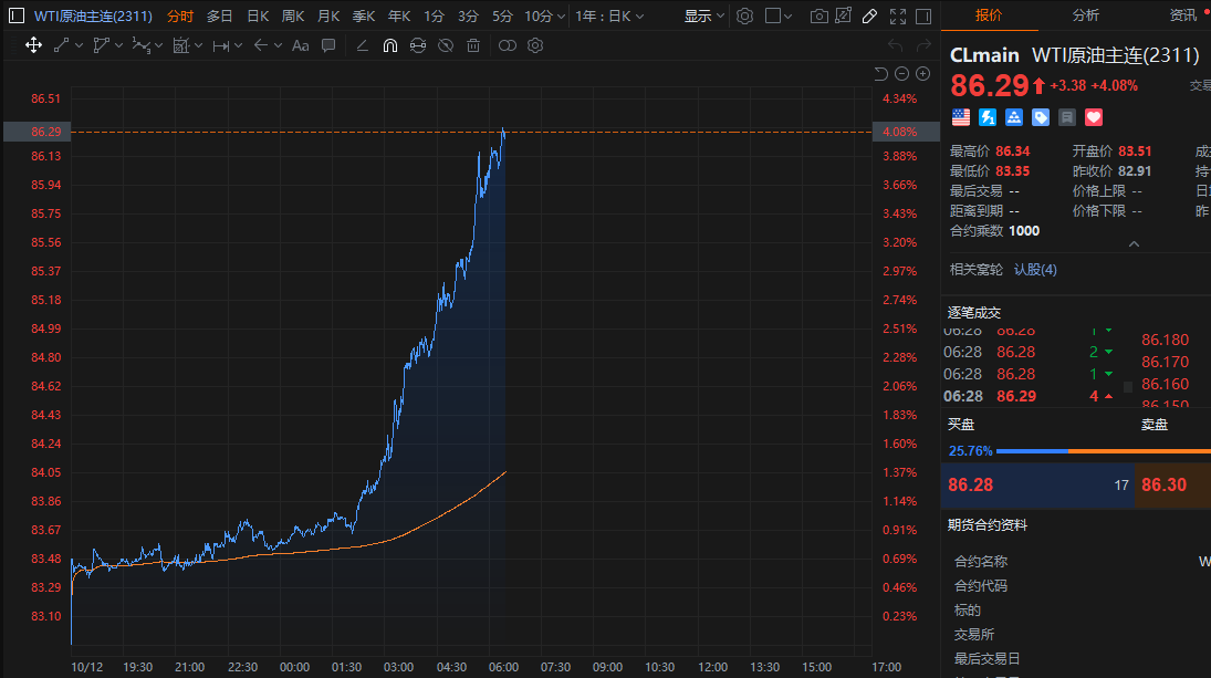 财联社10月13日电,WTI原油期货涨幅扩大至4%,报86.26美元/桶。布伦特原油期货涨3.8%,逼近90美元/桶。