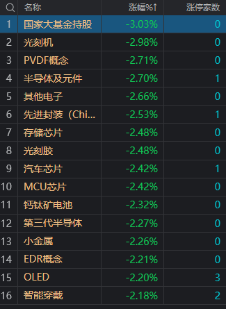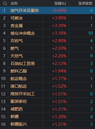 财联社10月16日电,大盘全天震荡调整,创业板指领跌。盘面上,油气股全天大涨,通源石油、准油股份、和顺石油、贝肯能源等近10股涨停。减肥药概念股继续活跃,百花医药、双鹭药业涨停。算力概念股震荡反弹,四川长虹、同方股份、真视通等涨停。ST板块逆势走强,ST天龙、*ST天山、*ST长方均20CM涨停。下跌方面,芯片股集体调整,好上好、雅克科技跌停。总体上个股跌多涨少,两市超3300只个股下跌。沪深两市今日成交额8129亿,较上个交易日放量45亿。板块方面,油气、贵金属、航运、减肥药等板块涨幅居前,半导体、存储芯片、OLED、锂矿等板块跌幅居前。截至收盘,沪指跌0.46%,深成指跌1.42%,创业板指跌2%。北向资金全天净卖出64.77亿元,其中沪股通净卖出37.27亿元,深股通净卖出27.5亿元。