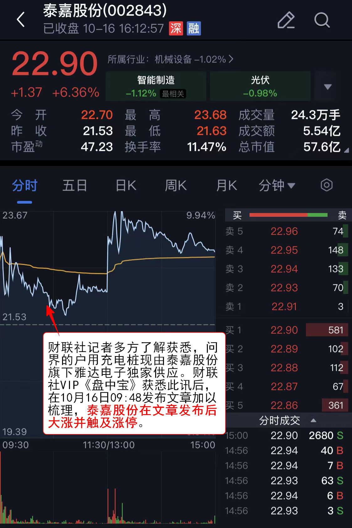 财联社记者多方了解获悉,问界的户用充电桩现由泰嘉股份旗下雅达电子独家供应。财联社VIP《盘中宝》获悉此讯后, 在10月16日09:48发布文章加以梳理 ,泰嘉股份在文章发布后大涨,日内触板。