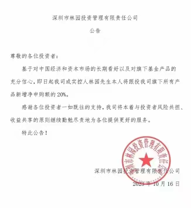 财联社10月16日电,林园投资今日公告称,基于对中国经济和资本市场的长期看好以及对旗下基金产品的充分信心,即日起,林园投资或实控人林园本人将跟投该司旗下所有产品新增净申购额的20%。林园投资目前管理规模约300亿元。(财联社记者 闫军)