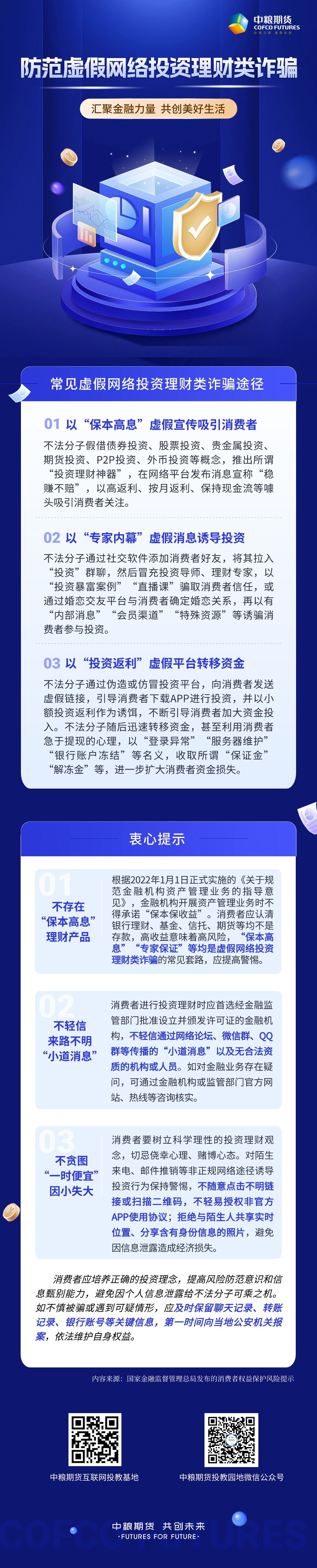 值此2023年“金融消费者权益保护教育宣传月”活动之际,中粮期货为您揭示常见虚假网络投资理财类诈骗途径,衷心提示您:不存在“保本高息”理财产品、不轻信来路不明“小道消息”、不贪图“一时便宜”因小失大。