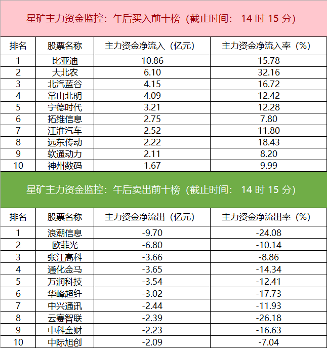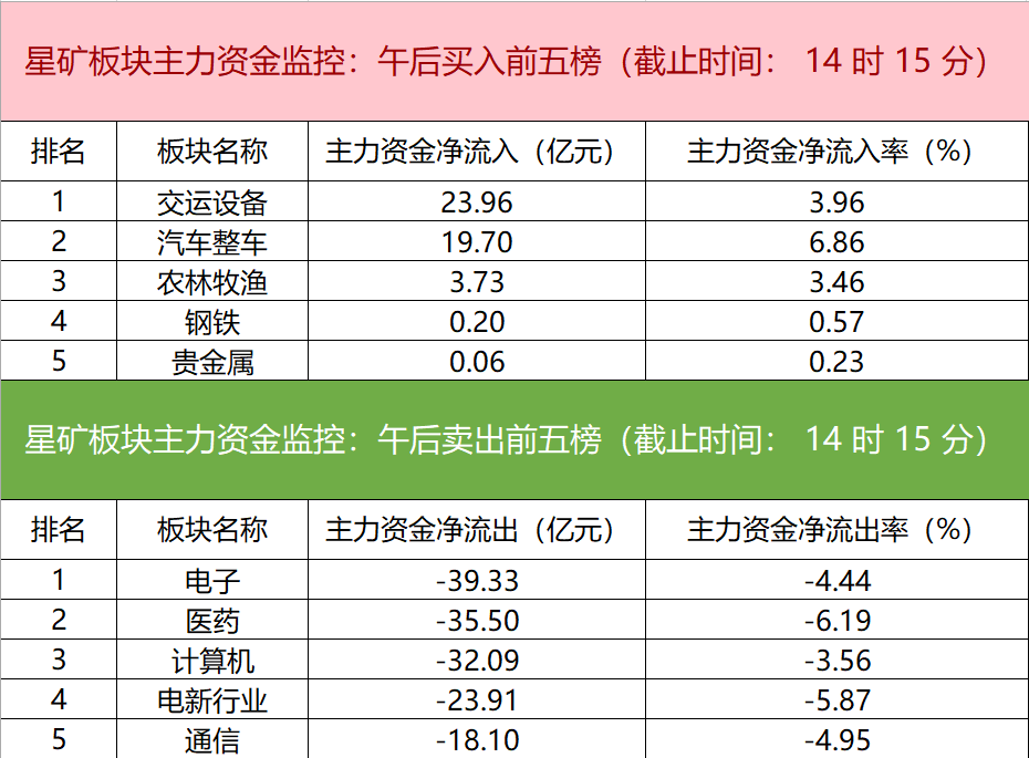 财联社10月18日电,财联社星矿数据显示,今日主力资金净流入交运设备、汽车整车、农林牧渔等板块,净流出电子、医药、计算机等板块,其中电子板块净流出39.33亿元。个股方面,比亚迪上涨,主力资金净买入10.86亿元,大北农、北汽蓝谷、常山北明获主力资金净流入居前;浪潮信息遭净卖出超9亿元,欧菲光、张江高科、通化金马等主力资金净流出额居前。