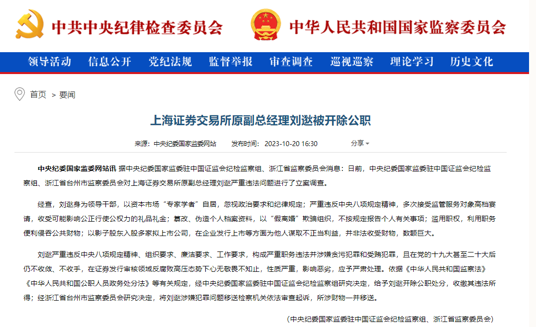 财联社10月20日电,据中央纪委国家监委驻中国证监会纪检监察组、浙江省监察委员会消息:日前,中央纪委国家监委驻中国证监会纪检监察组、浙江省台州市监察委员会对上海证券交易所原副总经理刘逖严重违法问题进行了立案调查。