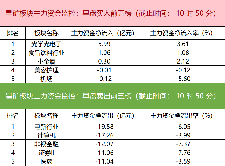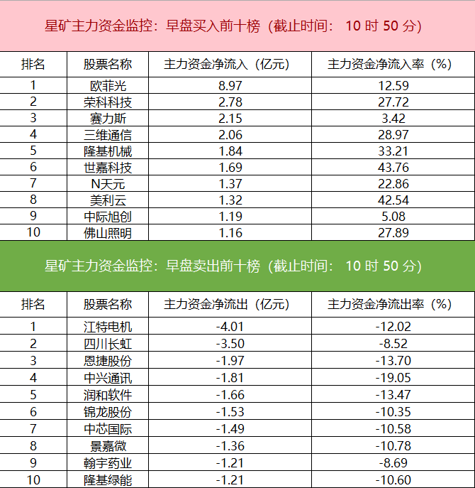财联社10月23日电,财联社星矿数据显示,今日早盘主力资金净流入光学光电子、食品饮料行业、小金属等板块,净流出电新行业、计算机、非银金融等板块,其中电新行业净流出超19亿元。个股方面,欧菲光一度涨停,主力资金净买入8.97亿元,荣科科技、赛力斯、三维通信获主力资金净流入居前;江特电机遭净卖出超4亿元,四川长虹、恩捷股份、中兴通讯主力资金净流出额居前。