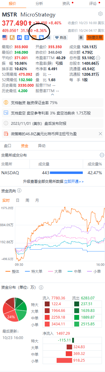 财联社10月24日电,微策略公司美股盘前涨超8%,该公司持有的46.8亿美元比特币的平均收购价为29582美元。