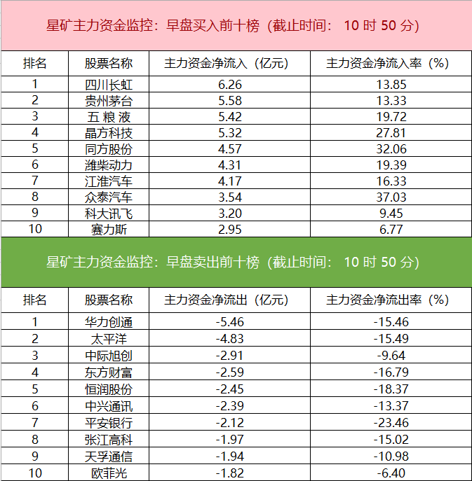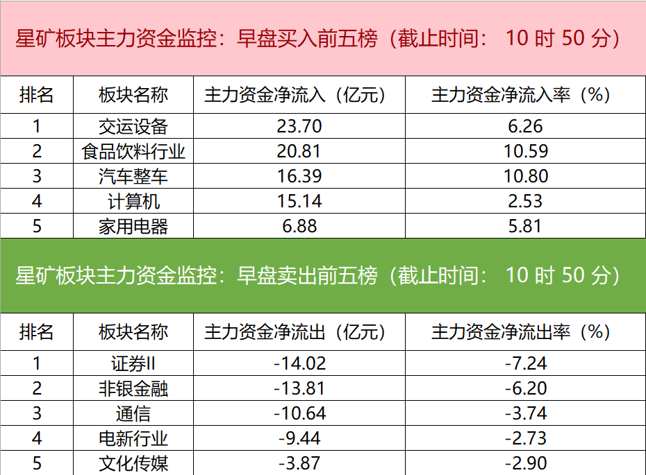 财联社10月25日电,财联社星矿数据显示,今日早盘主力资金净流入交运设备、食品饮料行业、汽车整车等板块,净流出证券Ⅱ、非银金融、通信等板块,其中交运设备板块净流入超23亿元。个股方面,四川长虹上涨,主力资金净买入6.26亿元,贵州茅台、五粮液、晶方科技获主力资金净流入居前;华力创通遭净卖出超5亿元,太平洋、中际旭创、东方财富主力资金净流出额居前。