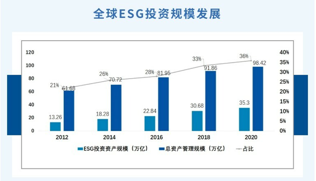 近些年来,ESG投资在资本市场的热度不断提高。全球可持续投资联盟(Global Sustainable Investment Alliance,简称GSIA)发布的《2020年全球可持续投资报告》显示,ESG投资的资产规模逐年扩大,2020年就已占到了全球总资产管理规模的36%。