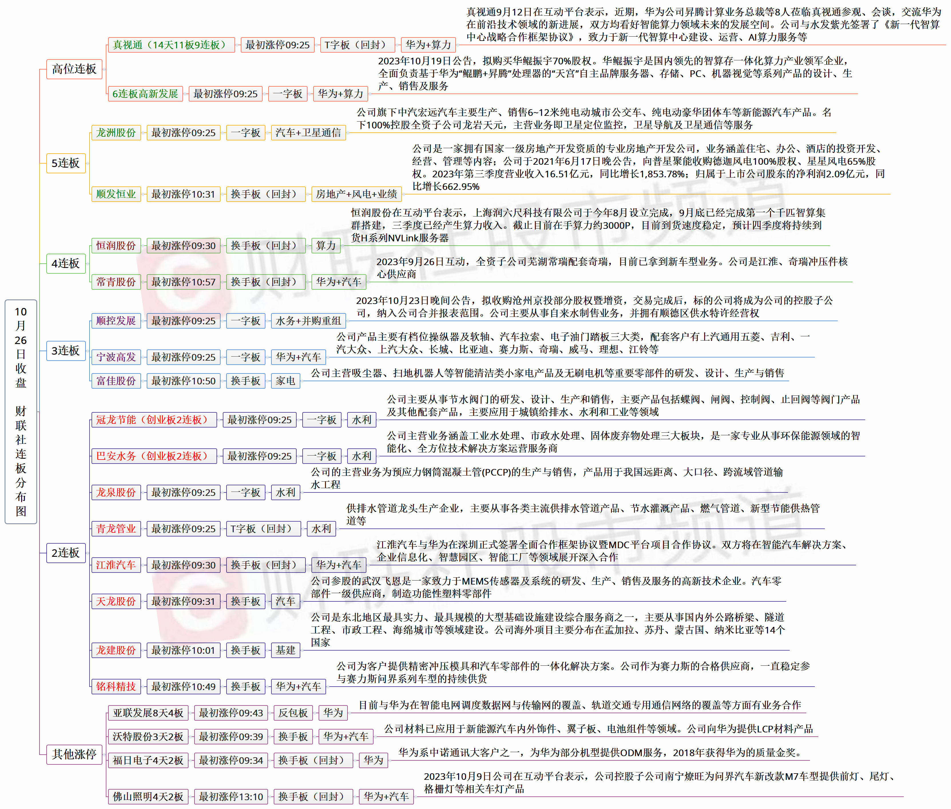 今日共42股涨停,连板股总数17只,其中三连板及以上个股9只,上一交易日共17只连板股,连板股晋级率53%(不含ST股、退市股及未开板新股)。本轮下行周期的领跌指数创业板指探底回升,指数反弹预期渐起,抱团高位股的环境生变,资金产生巨大分歧,连板龙头圣龙股份盘中炸板跳水收跌超7%,捷荣技术准“天地板”,高新发展开始放量。板块方面,华为产业链回暖,华为汽车分支强势领涨,常青股份9天5板、宁波高发3板,江淮汽车、天龙股份、铭科精技等2板,10月25日问界官宣M9目前大定已突破15000台的消息再度刺激板块走强,甚至力顶板块龙头圣龙股份跳水的压力上行;神舟十七号发射叠加北斗规模应用国际峰会开幕,卫星板块迎来高潮,北斗导航细分领涨,亚光科技、神剑股份、南京熊猫等低位股积极补涨。