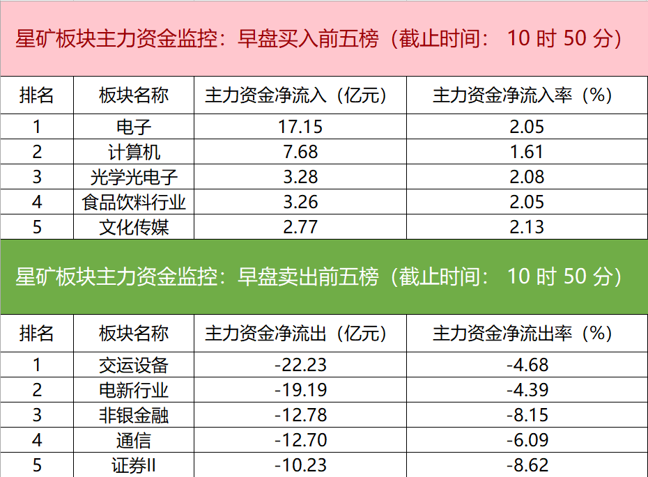 财联社10月30日电,财联社星矿数据显示,今日早盘主力资金净流入电子、计算机、光学光电子等板块,净流出交运设备、电新行业、非银金融等板块,其中交运设备板块净流出超22亿元。个股方面,五粮液上涨,主力资金净买入5.05亿元,首都在线、赛力斯、中芯国际获主力资金净流入居前;江淮汽车遭净卖出超5亿元,张江高科、恩捷股份、中国电信主力资金净流出额居前。