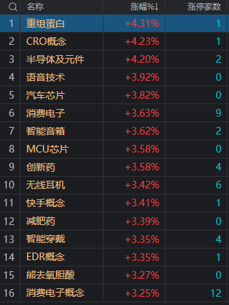 财联社10月30日电,市场早盘震荡分化,创业板指延续大涨。盘面上,医药股继续活跃,CRO方向领涨,成都先导、康龙化成涨超10%,九洲药业涨停。半导体板块大幅反弹,卓胜微、江海股份、东方嘉盛等涨停。消费电子概念股震荡走强,精研科技、春秋电子、恒铭达、国光电器等涨停。算力概念股维持强势,利通电子、启明信息、南兴股份等涨停。下跌方面,银行股陷入调整,邮储银行、中信银行跌超4%。总体上个股涨多跌少,两市超3600只个股上涨。沪深两市今日成交额6544亿,较上个交易日放量819亿。板块方面,CRO、半导体、消费电子、算力租赁等板块涨幅居前,汽车整车、银行、服装、汽车零部件等板块跌幅居前。截至收盘,沪指涨0.17%,深成指涨1.53%,创业板指涨2.33%。北向资金方面,沪股通早盘净流出10.34亿,深股通早盘净流入17.14亿。