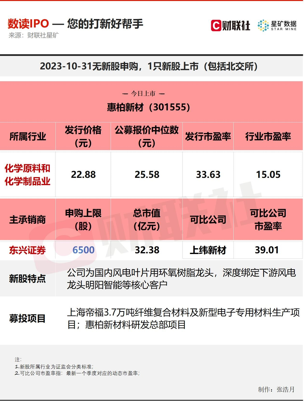 财联社10月31日电,今日无新股申购;1只新股上市,创业板的惠柏新材。惠柏新材为国内风电叶片用环氧树脂龙头。