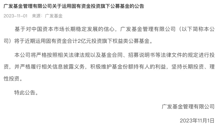 财联社11月1日电,广发基金今日早间发布公告称,基于对中国资本市场长期稳定发展的信心,公司将于近期运用固有资金合计2亿元投资旗下权益类公募基金。这也是今年8月以来广发基金第二次官宣自购。(记者 沈述红)