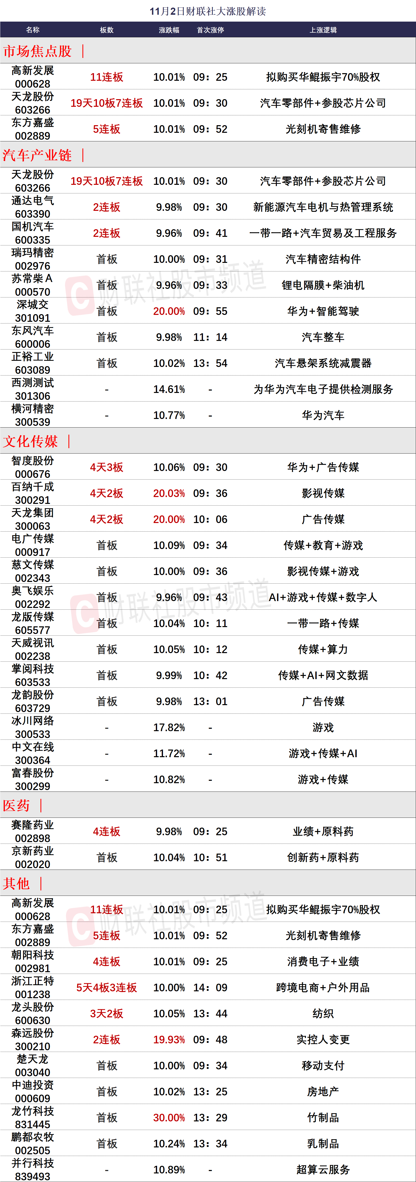 今日共30股涨停,连板股总数9只,13股封板未遂,封板率为70%(不含ST股、退市股及未开板新股)。个股方面,并购重组的高新发展11板,汽车产业链的天龙股份19天10板、通达电气2板,光刻机概念股东方嘉盛5板,消费电子+业绩的朝阳科技4板,医药股赛隆药业4板,跨境电商板块浙江正特5天4板,传媒股智度股份4天3板、百纳千成创业板4天2板、天龙集团创业板4天2板,实控人变更的森远股份创业板2板。今日收涨个股855只,收跌个股4079只。
