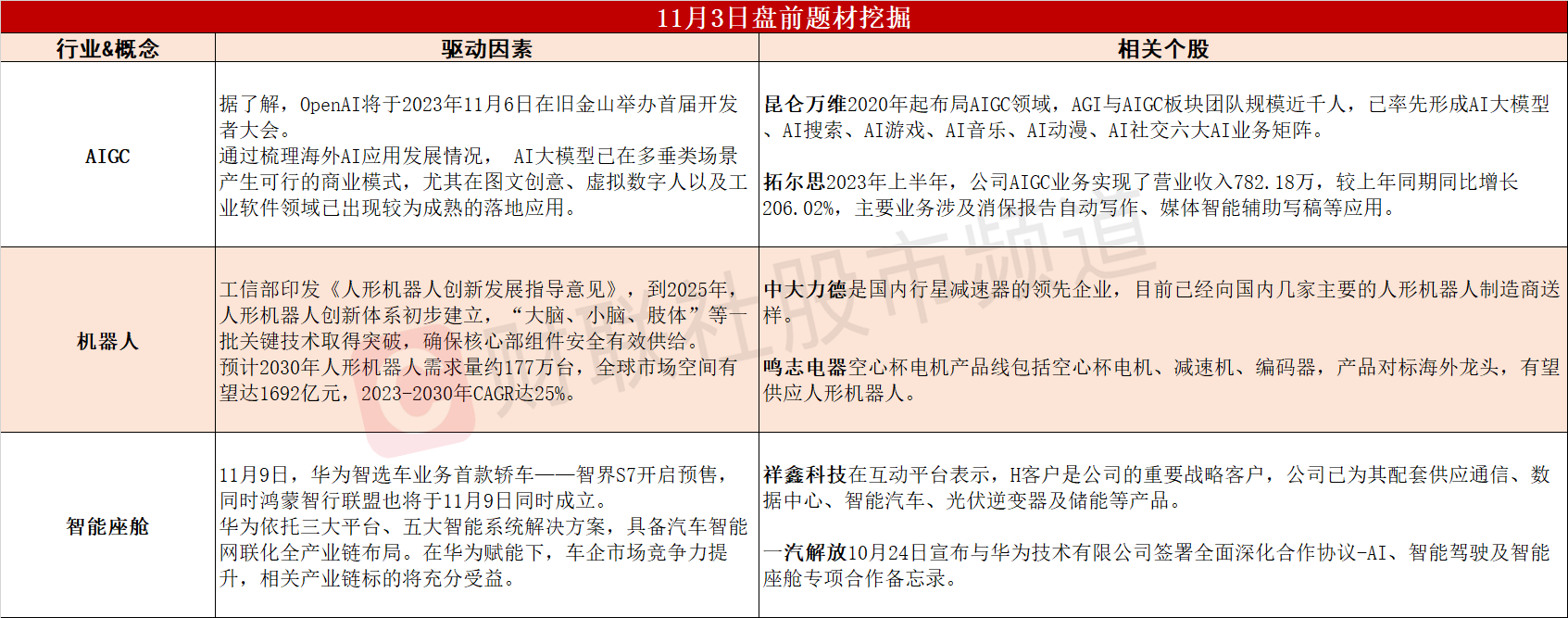 ①OpenAI首届开发者大会即将开幕,AI应用端有望再迎强力催化。②工信部印发人形机器人重磅文件,人形机器人产业化提速。③鸿蒙智行联盟将于11月9日成立,华为智驾产业链或将充分受益。