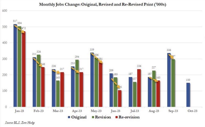 财联社11月6日电,上周五,美国劳工统计局公布的10月非农就业人数仅新增15万人,远低于市场预期,美国劳动力市场在猛烈加息下需求转弱的趋势似乎已初露端倪。而在这份疲软的非农报告中,8月和9月的非农就业人数也分别被下修了6.2万人和3.8万人,这不免再度令人聚焦于了年内非农数据的“不靠谱”——习惯于在月初数据中夸大上月就业人数。如下图所示,在过去9个月里非农就业数据有8个月最终被下修。通常,美国劳工统计局每个月都会通过抽样获得雇主的反馈,并据此在月初发布一系列行业的就业估计数据。在每一份新的月度就业报告中,前两个月的数据通常都会被修正,因为更多的企业会提交工资单数据。而如果年内美国劳工部夸大非农的“前科”确实存在,人们显然不能排除10月非农比上周五公布的15万人更少的可能性。