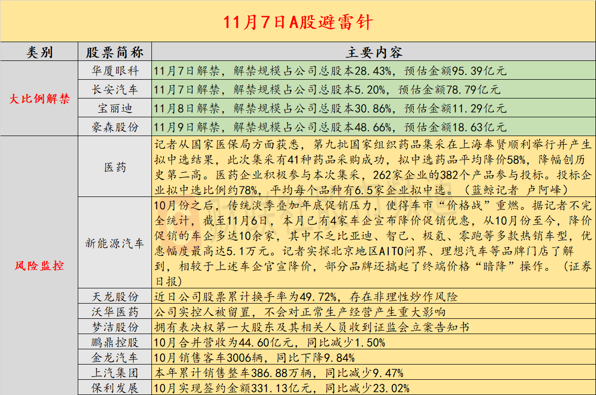 近日没有公司发布减持公告;华厦眼科、宝丽迪将迎来超二成以上解禁;多家车企官宣降价,车市打响年终“价格战”;9连板天龙股份提示风险,近日公司股票累计换手率为49.72%,存在非理性炒作风险;第九批国采平均降价58%,降幅创历史第二高;沃华医药公司实控人被留置,公司称不会对正常生产经营产生重大影响;斗鱼方面证实CEO陈少杰失联,斗鱼美股跌超10%。