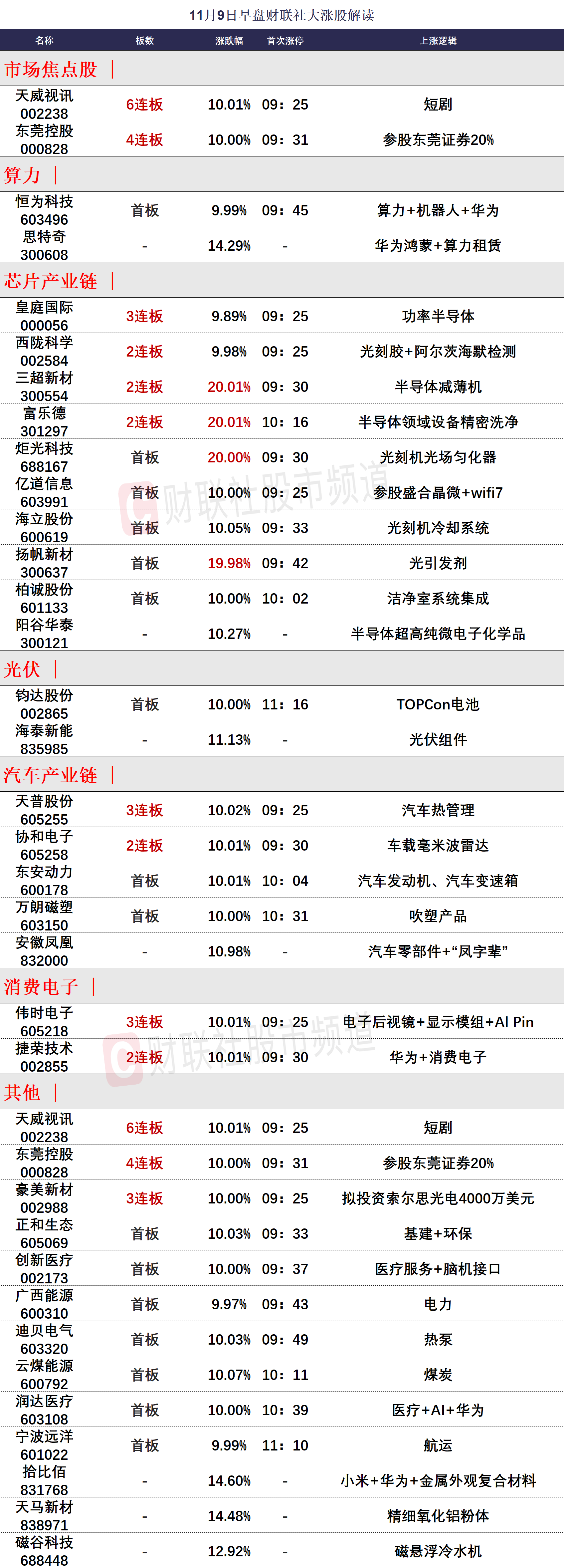 今日午盘两市共27股涨停,连板股总数11只,21股封板未遂,封板率为56%(不含ST股、退市股及未开板新股)。个股方面,传媒股天威视讯6板,参股券商的东莞控股4板,芯片产业链的皇庭国际3板、三超新材创业板2板、富乐德创业板2板,汽车产业链的天普股份3板。