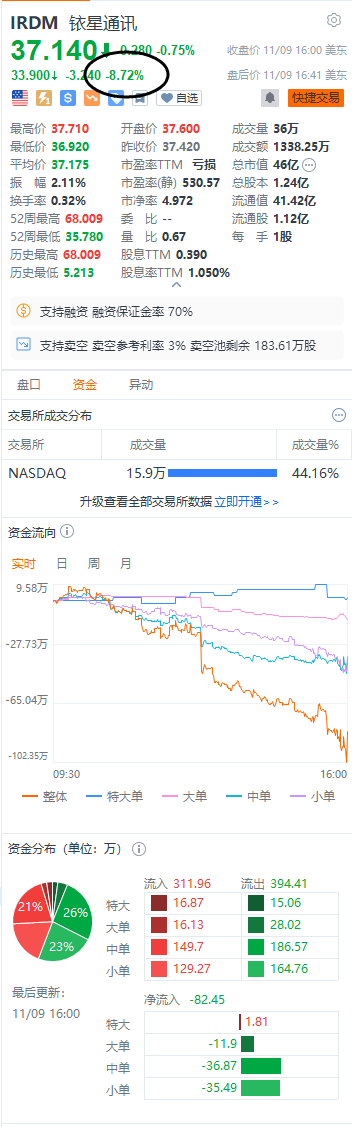铱星通讯美股盘后跌近9%