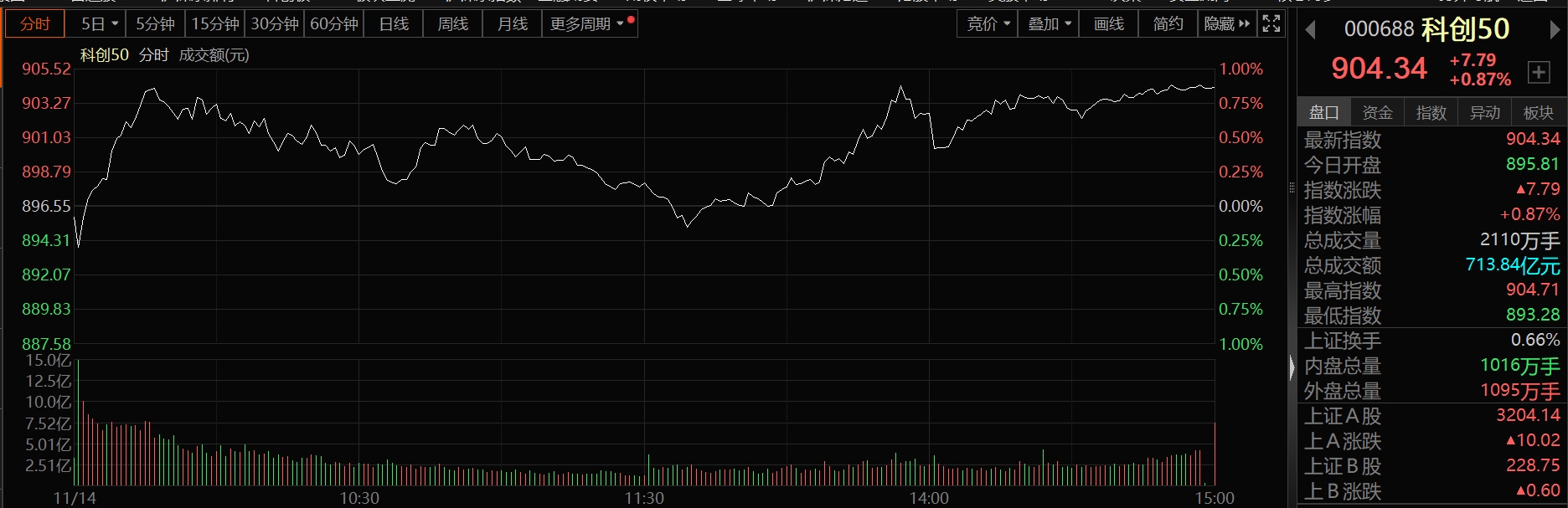 《科创板日报》14日讯,今日,科创50指数震荡收涨0.87%,报904.34点。盘面上,算力芯片概念股午后集体走高,寒武纪大涨13.19%,云天励飞涨8.99%,海光信息、龙芯中科等跟涨。消息面上,汇纳科技盘中发布算力服务涨价信息。半导体板块震荡拉升,炬光科技、芯海科技、恒玄科技等多股涨超5%。鸿蒙概念股延续昨日强势,九联科技再次收获20CM涨停。