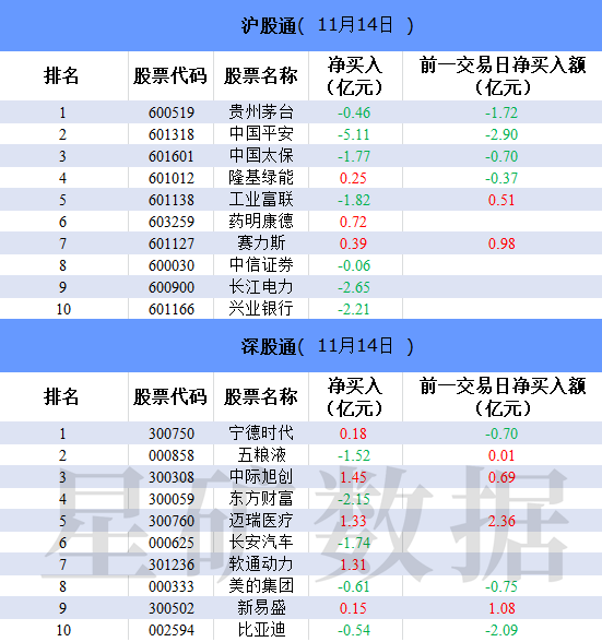 财联社11月14日电,北向资金今日净卖出21.09亿元。中国平安、长江电力、兴业银行分别遭净卖出5.11亿元、2.65亿元、2.21亿元;中际旭创逆势获净买入1.45亿元。