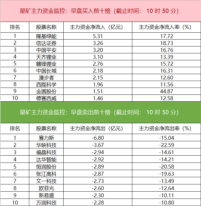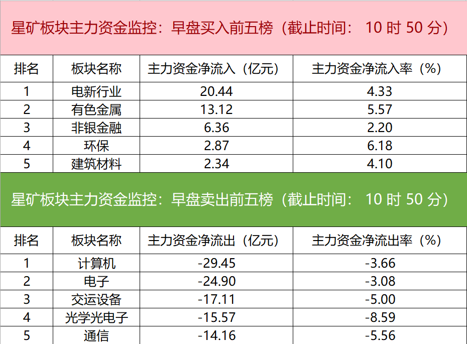 财联社11月15日电,财联社星矿数据显示,今日早盘主力资金净流入电新行业、有色金属、非银金融等板块,净流出计算机、电子、交运设备等板块,其中计算机板块净流出超29亿元。个股方面,隆基绿能上涨,主力资金净买入5.31亿元,信达证券、中国平安、天齐锂业获主力资金净流入居前;赛力斯遭净卖出超6亿元,华映科技、福晶科技、达华智能主力资金净流出额居前。