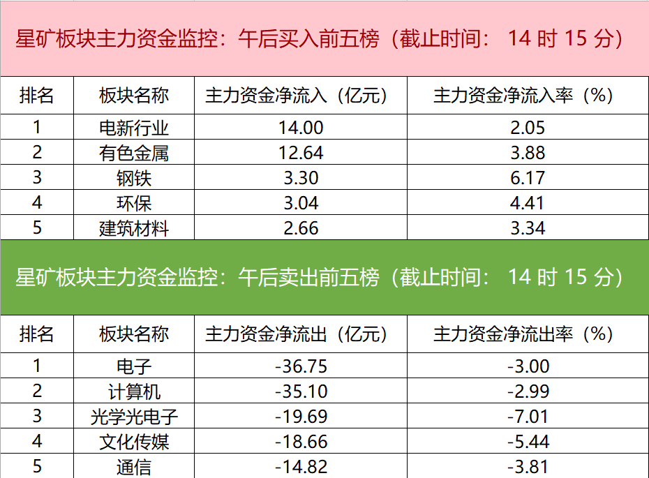 财联社11月15日电,财联社星矿数据显示,今日主力资金净流入电新行业、有色金属、钢铁等板块,净流出电子、计算机、光学光电子等板块,其中电子板块净流出36.75亿元。个股方面,中国长城大涨,主力资金净买入5.95亿元,长安汽车、隆基绿能、中国平安获主力资金净流入居前;中文在线遭净卖出超5亿元,赛力斯、文一科技、华映科技等主力资金净流出额居前。
