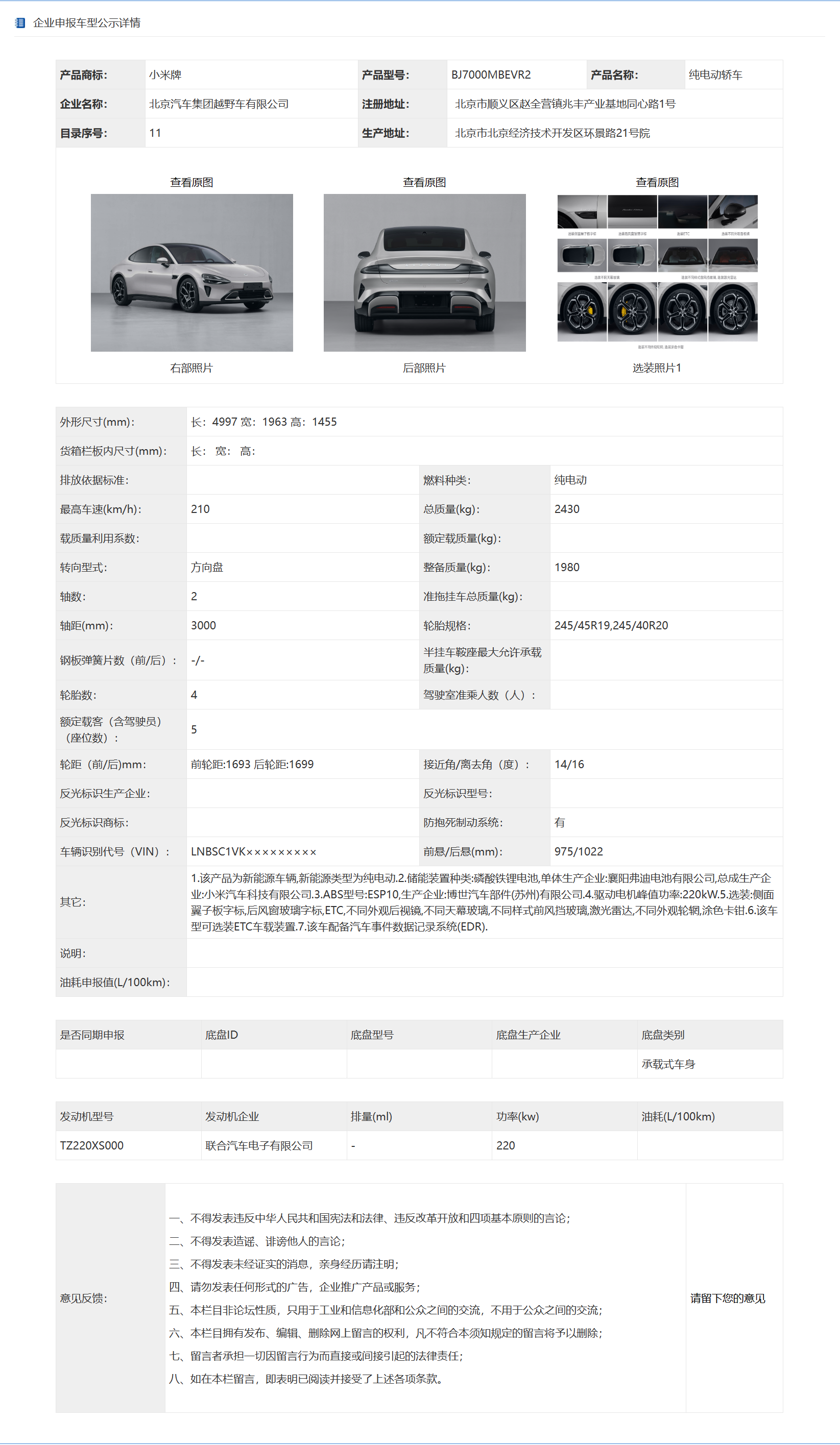 第377批《道路机动车辆生产企业及产品公告》新产品公示:两款小米牌纯电动轿车在列