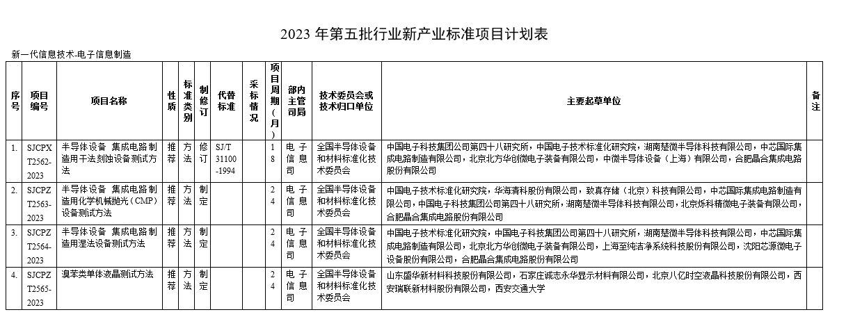 财联社11月16日电,据工信部网站消息,根据标准化工作的总体安排,工信部现将申请立项的《半导体设备 集成电路制造用干法刻蚀设备测试方法》等196项行业标准、《雪莲养护贴》等1项行业标准外文版项目和《环境污染防治设备 术语》等38项推荐性国家标准计划项目予以公示,截止日期为2023年12月16日。其中,关于《半导体设备 集成电路制造用干法刻蚀设备测试方法》,主要起草单位包括中国电子科技集团公司第四十八研究所,中国电子技术标准化研究院,湖南楚微半导体科技有限公司,中芯国际集成电路制造有限公司,北京北方华创微电子装备有限公司,中微半导体设备(上海)有限公司,合肥晶合集成电路股份有限公司等。