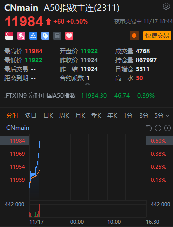 财联社11月17日电,富时A50中国指数期货重开后走高,涨幅扩大至0.5%。