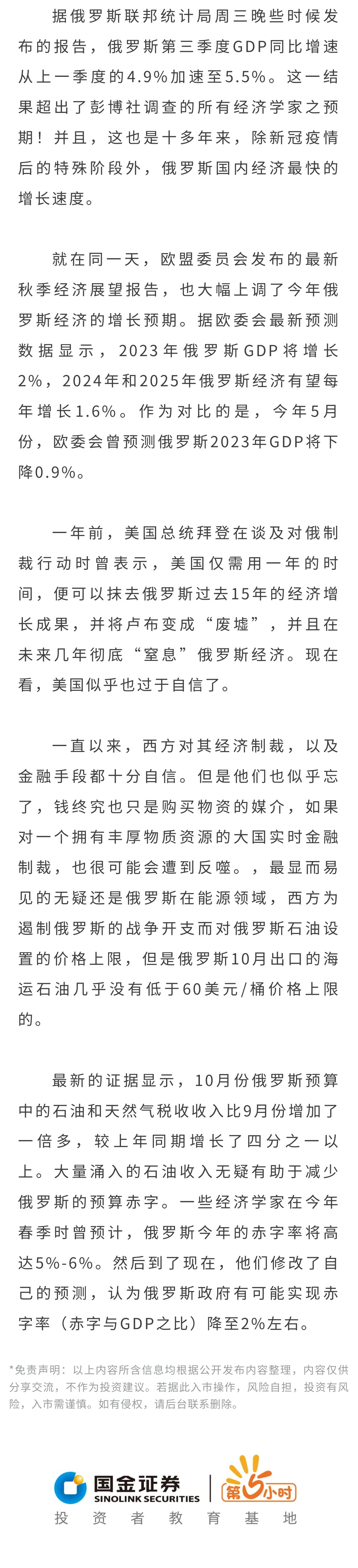 据俄罗斯联邦统计局周三晚些时候发布的报告,俄罗斯第三季度GDP同比增速从上一季度的4.9%加速至5.5%。这一结果超出了彭博社调查的所有经济学家之预期!并且,这也是十多年来,除新冠疫情后的特殊阶段外,俄罗斯国内经济最快的增长速度。