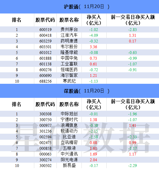 财联社11月20日电,北向资金今日净买入13.73亿元。韦尔股份、阳光电源、中兴通讯分别净买入3.36亿元、2.04亿元、1.69亿元。江淮汽车净卖出额居首,金额为4.09亿元。