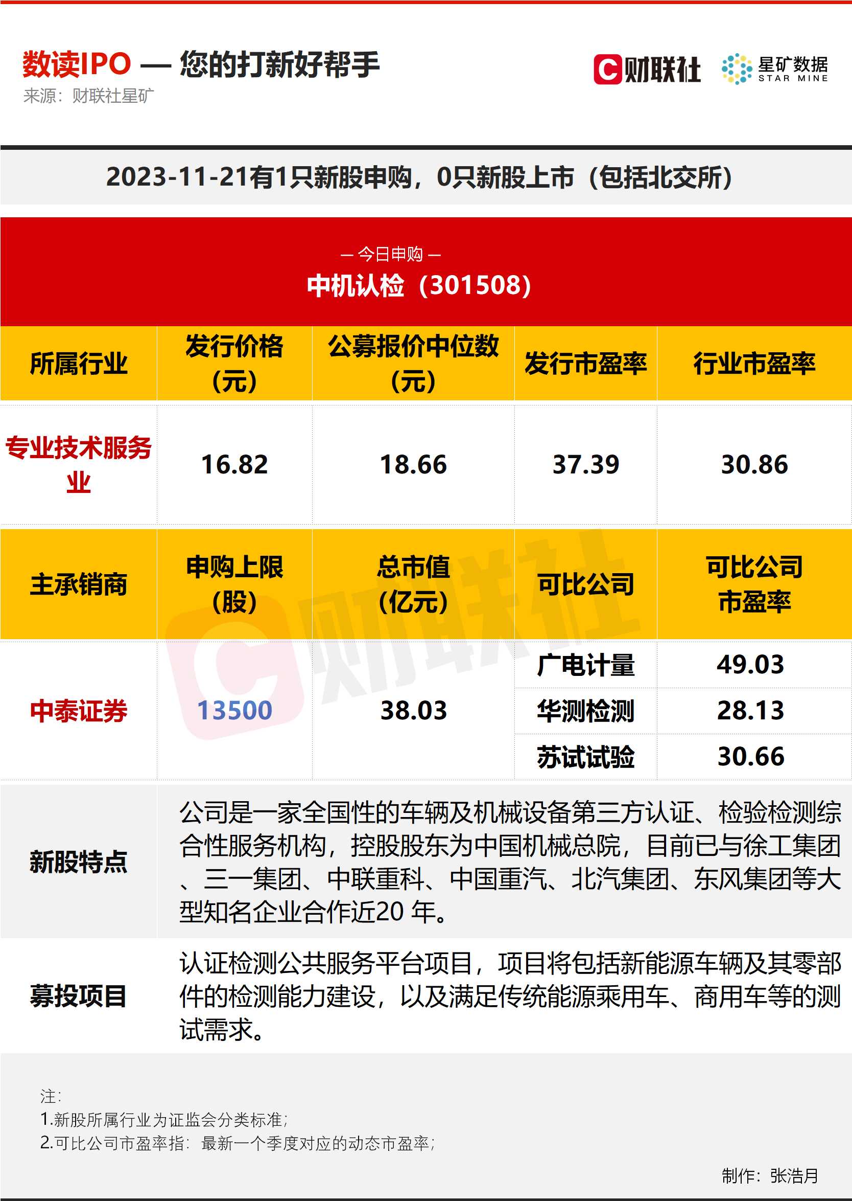 财联社11月21日电,今日有1只新股申购,为创业板的中机认检;无新股上市。中机认检是一家全国性的车辆及机械设备第三方认证、检验检测综合性服务机构。