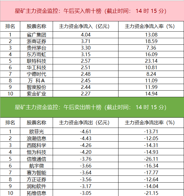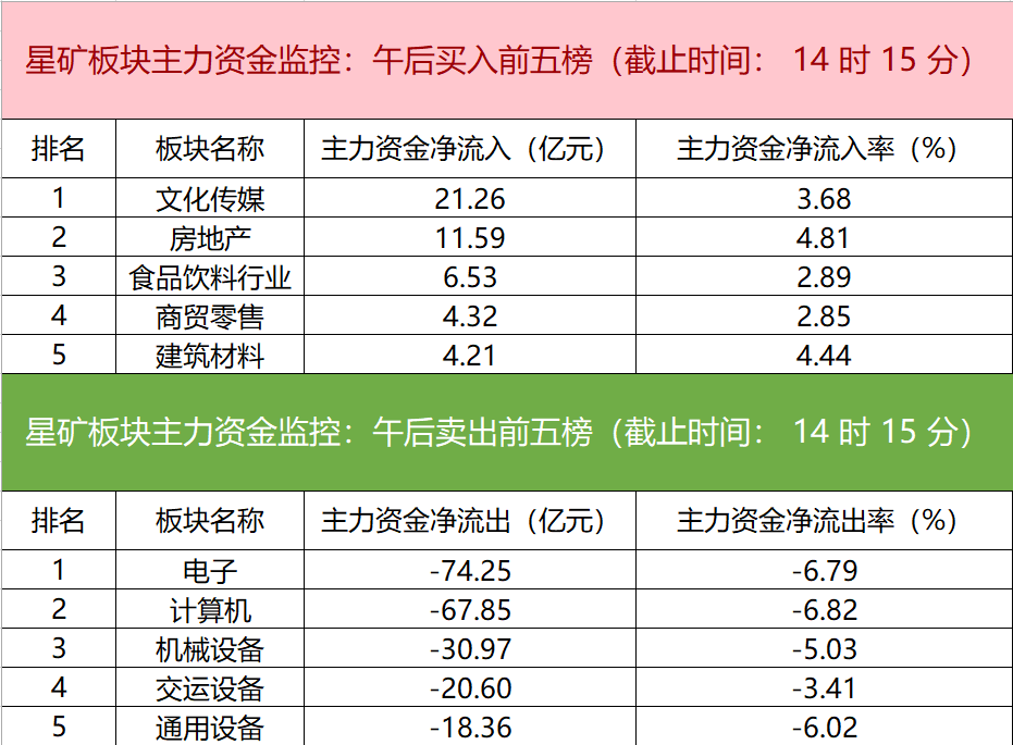 财联社11月21日电,财联社星矿数据显示,今日主力资金净流入文化传媒、房地产、食品饮料等板块,净流出电子、计算机、机械设备等板块,其中电子板块净流出74.25亿元。个股方面,省广集团涨停,主力资金净买入4.04亿元,浙商证券、贵州茅台、东方雨虹获主力资金净流入居前;欧菲光遭净卖出超4亿元,浪潮信息、西陇科学、恒为科技等主力资金净流出额居前。
