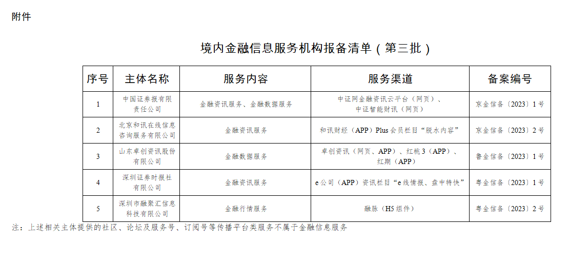 财联社11月21日电,根据《关于开展境内金融信息服务报备工作的通知》,为提高金融信息服务质量,促进金融信息服务业健康发展,国家互联网信息办公室组织开展境内金融信息服务报备工作。现公开发布第三批5家金融信息服务机构的名称及报备编号。