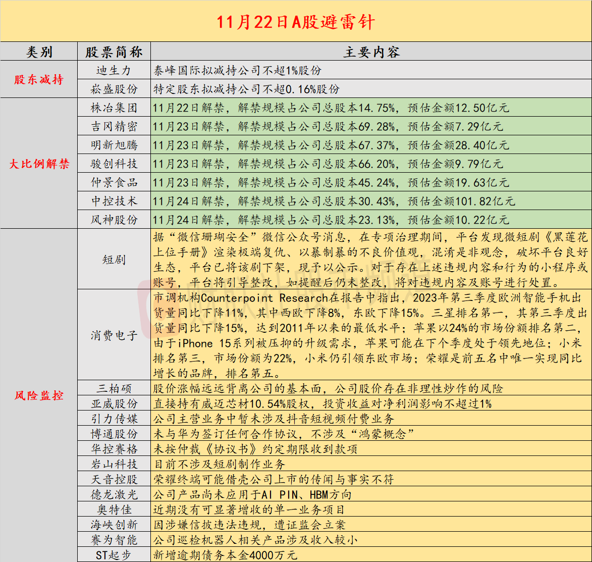 昨日公告的A股拟减持的公司数量较之前有所增多,迪生力股东泰峰国际拟减持公司不超1%股份,崧盛股份特定股东拟减持公司不超0.16%股份;明新旭腾、仲景食品将迎来超四成以上解禁;北京发布寒潮蓝色预警,关停户外游乐项目;8连板三柏硕提示风险,股价涨幅远远背离公司的基本面,公司股价存在非理性炒作的风险;微信平台下架微短剧《黑莲花上位手册》,因其渲染极端复仇、以暴制暴的不良价值观;4连板亚威股份称直接持有威迈芯材10.54%股权,投资收益对净利润影响不超过1%;英伟达预计第四财季对中国的销售将大幅下降。