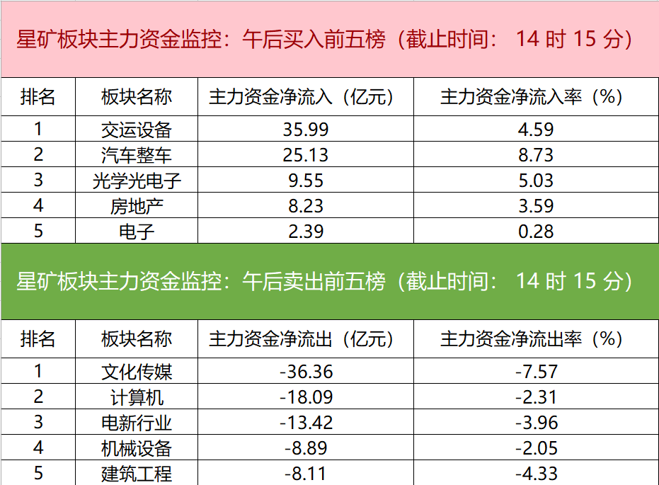 财联社11月23日电,财联社星矿数据显示,今日主力资金净流入交运设备、汽车整车、光学光电子等板块,净流出文化传媒、计算机、电新行业等板块,其中文化传媒板块净流出36.36亿元。个股方面,长安汽车一度涨停,主力资金净买入23.15亿元,华映科技、浪潮信息、远东传动获主力资金净流入居前;亚威股份遭净卖出超3亿元,太极实业、众合科技、蓝色光标等主力资金净流出额居前。