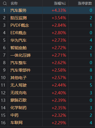 财联社11月23日电,大盘全天震荡反弹,三大指数均小幅上涨。北证50指数早盘一度涨超5%随后快速跳水翻绿,最终跌超2%。盘面上,汽车产业链全线走强,华阳集团、湖南天雁、渤海汽车、远东传动等多股涨停。医药股展开反弹,粤万年青、桂林三金、联环药业涨停。房地产板块震荡走强,金科股份、大龙地产涨停。消费电子概念股表现活跃,惠威科技、瀛通通讯、实益达等涨停。下跌方面,短剧概念股陷入调整,海看股份、佳云科技跌超10%。此外,高位连板股集体补跌,亚威股份、三柏硕、银宝山新等多股跌停。总体上个股涨多跌少,全市场超4100只个股上涨。沪深两市今日成交额8242亿,较上个交易日缩量513亿。板块方面,汽车零部件、无人驾驶、中药、房地产等板块涨幅居前,短剧、教育、深圳国资、手机游戏等板块跌幅居前。截至收盘,沪指涨0.6%,深成指涨0.78%,创业板指涨0.58%。北向资金全天净买入50.58亿元,其中沪股通净买入19.29亿元,深股通净买入31.29亿元。