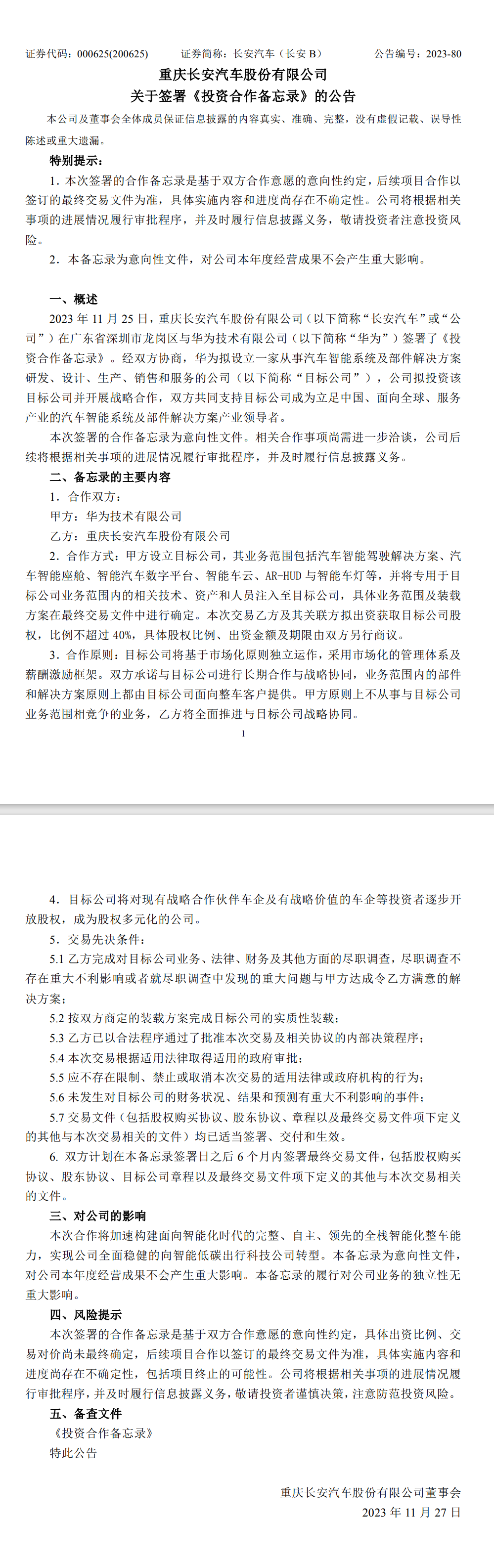 财联社11月26日电,长安汽车公告,与华为签署《投资合作备忘录》。经双方协商,华为拟设立一家从事汽车智能系统及部件解决方案研发、设计、生产、销售和服务的公司,公司拟投资该目标公司并开展战略合作,双方共同支持目标公司成为立足中国、面向全球、服务产业的汽车智能系统及部件解决方案产业领导者。本次交易长安汽车及其关联方拟出资获取目标公司股权,比例不超过40%,具体股权比例、出资金额及期限由双方另行商议。华为原则上不从事与目标公司业务范围相竞争的业务,长安汽车将全面推进与目标公司战略协同。目标公司将对现有战略合作伙伴车企及有战略价值的车企等投资者逐步开放股权,成为股权多元化的公司。双方计划在本备忘录签署日之后6个月内签署最终交易文件。