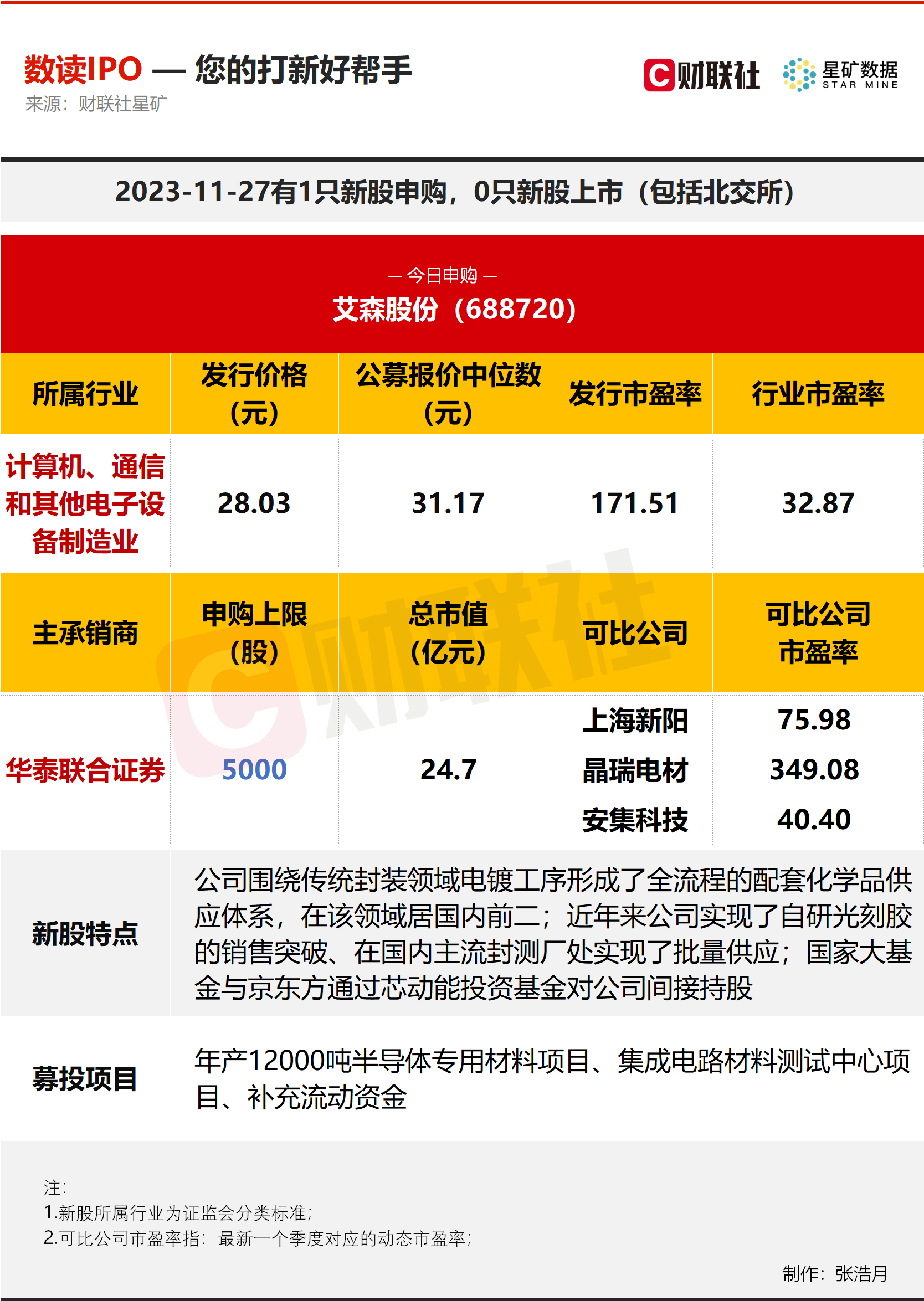 财联社11月27日电,今日有1只新股申购,为科创板的艾森股份;无新股上市。艾森股份为国内集成电路封测领域电子化学品主要供应商。