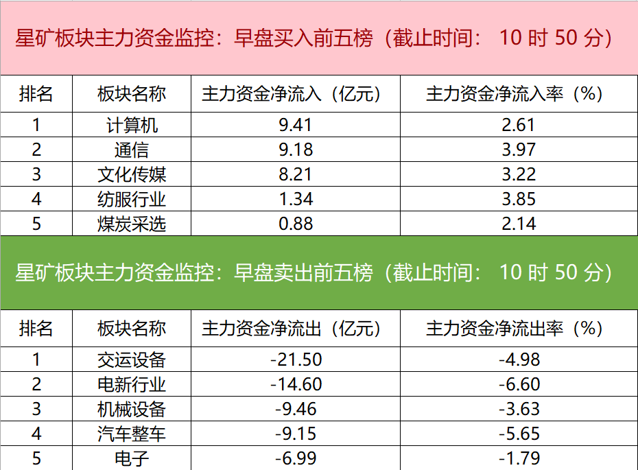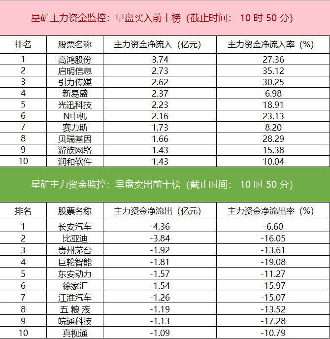 财联社12月1日电,财联社星矿数据显示,今日早盘主力资金净流入计算机、通信、文化传媒等板块,净流出交运设备、电新行业、机械设备等板块,其中交运设备板块净流出超21亿元。个股方面,高鸿股份涨停,主力资金净买入3.74亿元,启明信息、引力传媒、新易盛获主力资金净流入居前;长安汽车遭净卖出超4亿元,比亚迪、贵州茅台、巨轮智能主力资金净流出额居前。