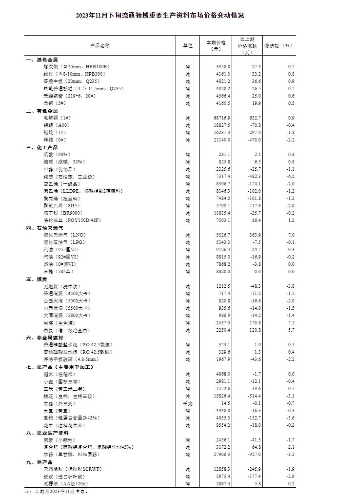 财联社12月4日电,国家统计局数据显示,据对全国流通领域9大类50种重要生产资料市场价格的监测显示,2023年11月下旬与11月中旬相比,17种产品价格上涨,30种下降,3种持平。其中,液化天然气(LNG)价格报5526.7元/吨,环比上涨7%。
