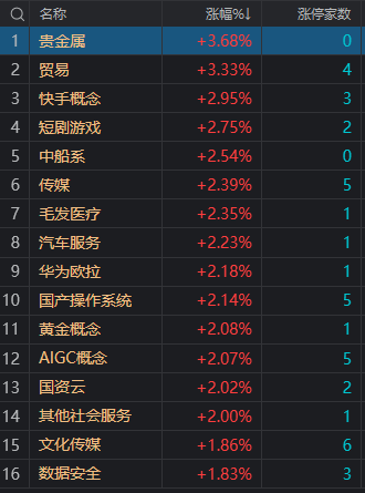 财联社12月4日电,市场早盘窄幅震荡,三大指数均小幅下跌。盘面上,短剧概念股继续活跃,因赛集团、引力传媒、中广天择涨停。跨境贸易概念股集体走强,南京商旅、江苏舜天、苏豪弘业涨停。流感概念股展开反弹,振东制药涨超10%,益盛药业涨停。数据要素概念股盘中异动,银之杰、深桑达A涨停。整体上,早盘市场热点呈现快速轮动特征。下跌方面,CRO概念股陷入调整,药明康德等多股跌超5%。总体上个股涨多跌少,全市场超2700只个股上涨。沪深两市今日成交额5534亿,较上个交易日放量874亿。板块方面,短剧、黄金概念、国资云、猪肉等板块涨幅居前,CRO、复合集流体、食品加工、白酒等板块跌幅居前。截至收盘,沪指跌0.04%,深成指跌0.15%,创业板指跌0.25%。北向资金方面,沪股通早盘净流出3.48亿,深股通早盘净流出11.6亿。