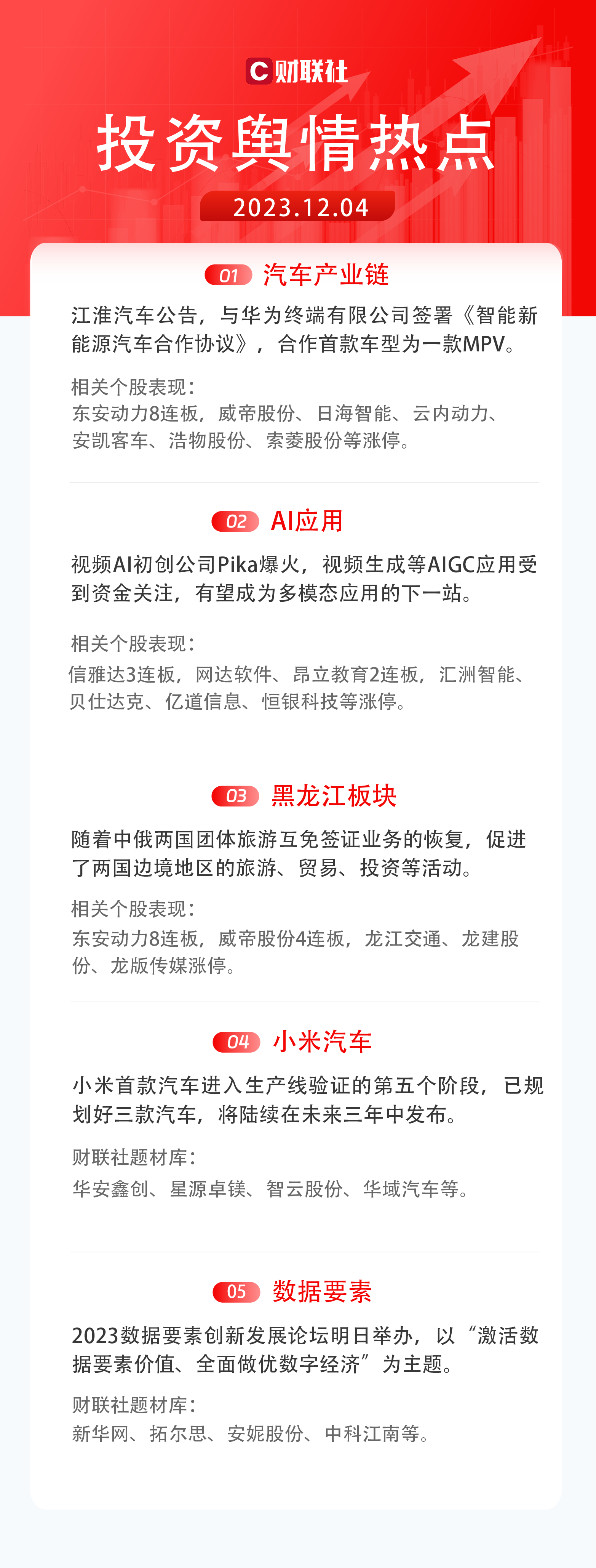 1)汽车产业链:江淮汽车公告,与华为终端有限公司签署《智能新能源汽车合作协议》,合作首款车型为一款MPV。